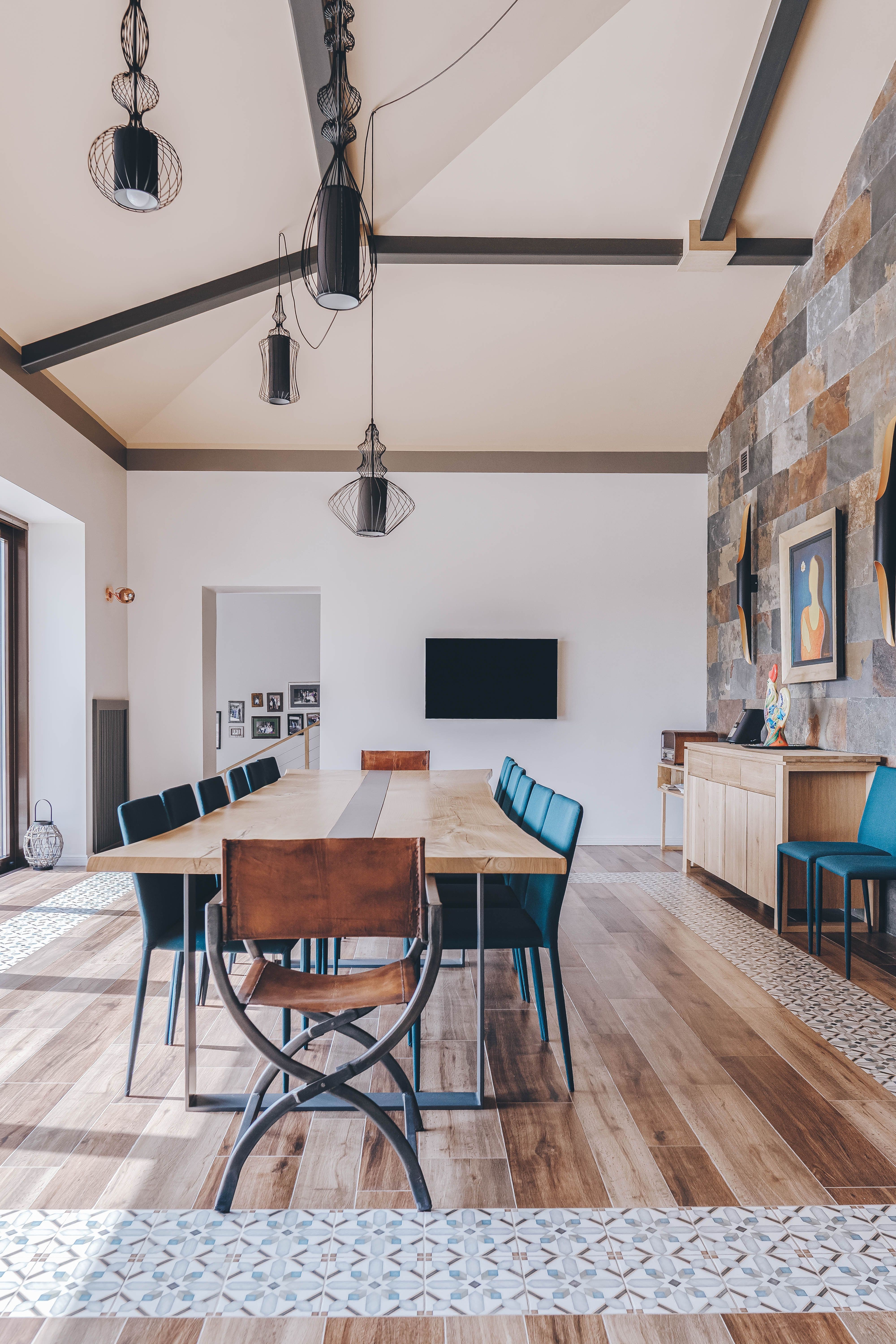 В патио разместилась просторная зона для приема гостей со столом из массива с оригинальными стульями.