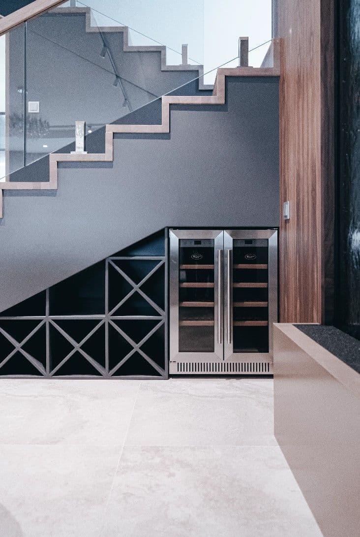 Идея разместить в подлестничном пространстве винный холодильник, позволила добавить функциональности без ущерба для интерьера.