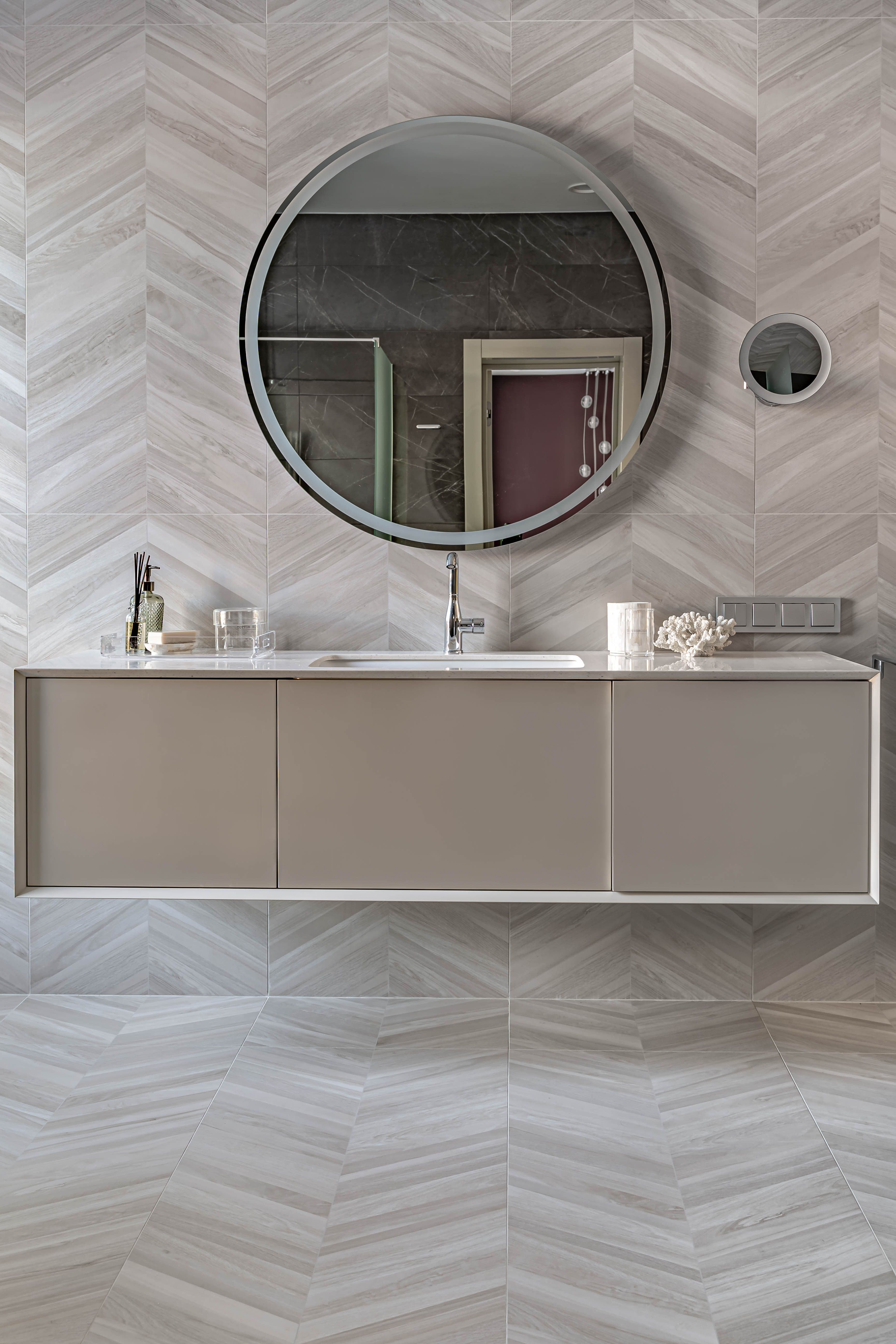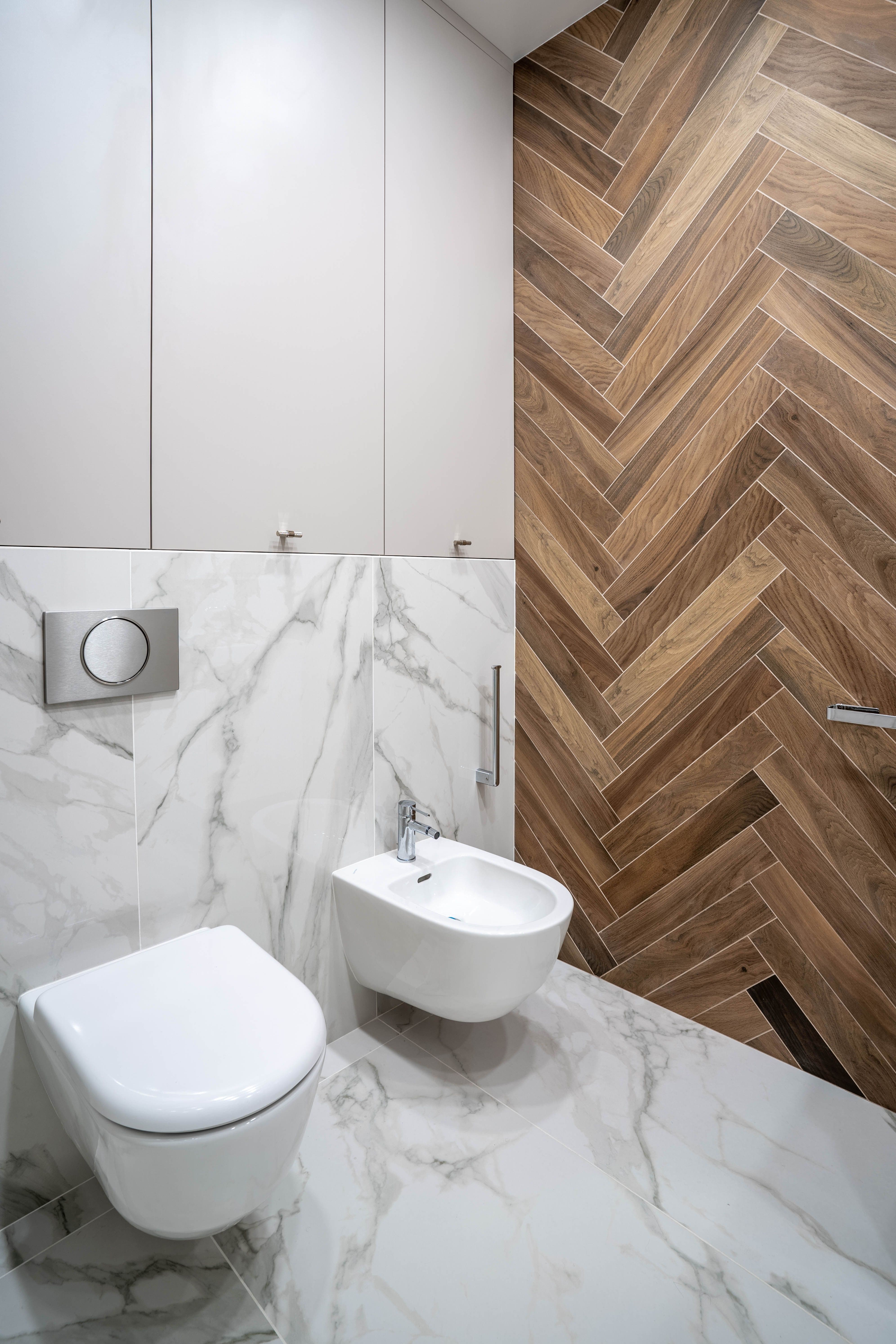 В гостевом санузле выполнили акцентную стену из керамогранита, поверхность которого имитирует рисунок натурального дерева.
