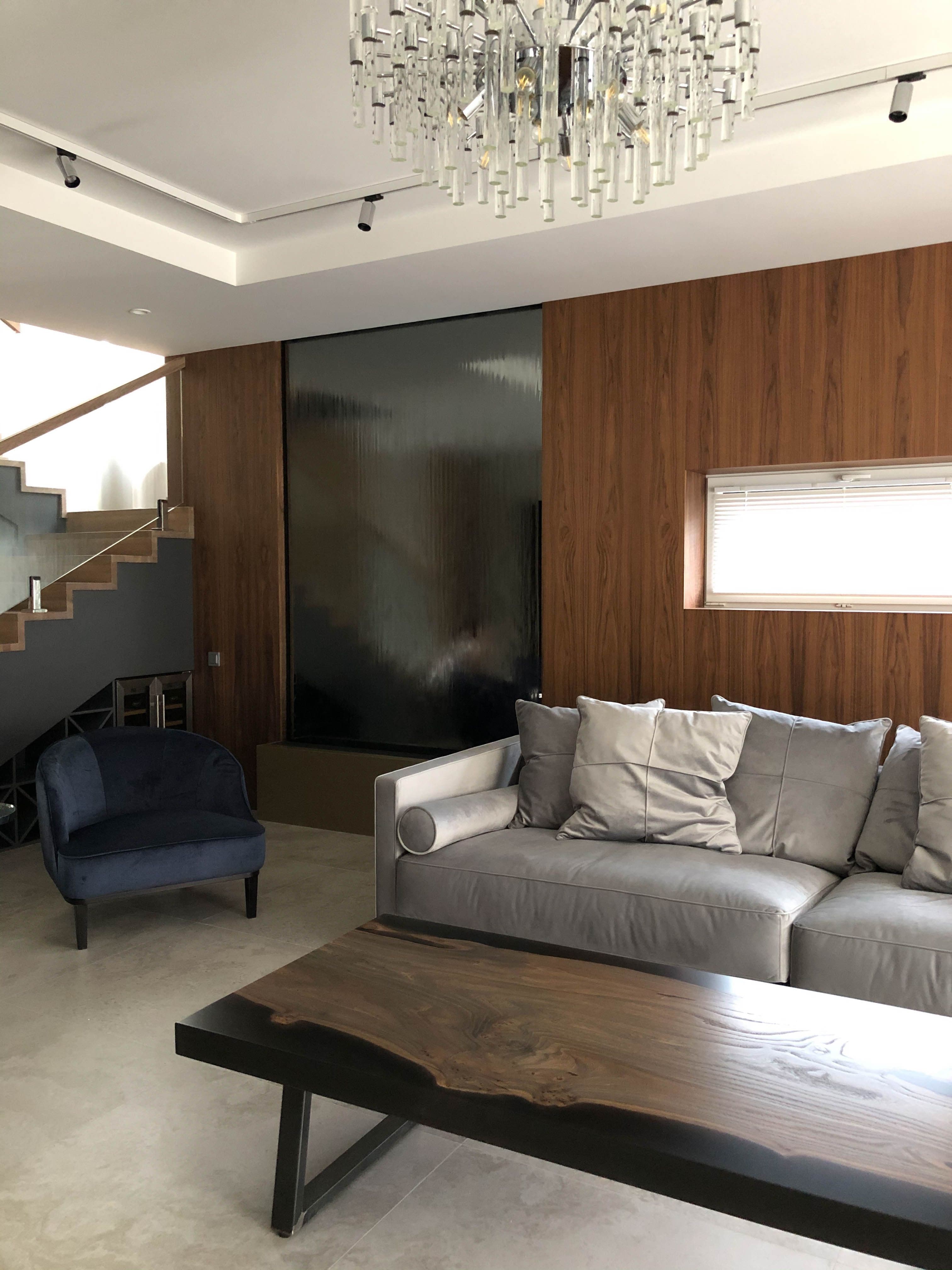 Акцентная стена из шпонированных панелей и керамогранит имитирующий поверхность бетона создают пограничную атмосферу загородного дома и городской квартиры.
