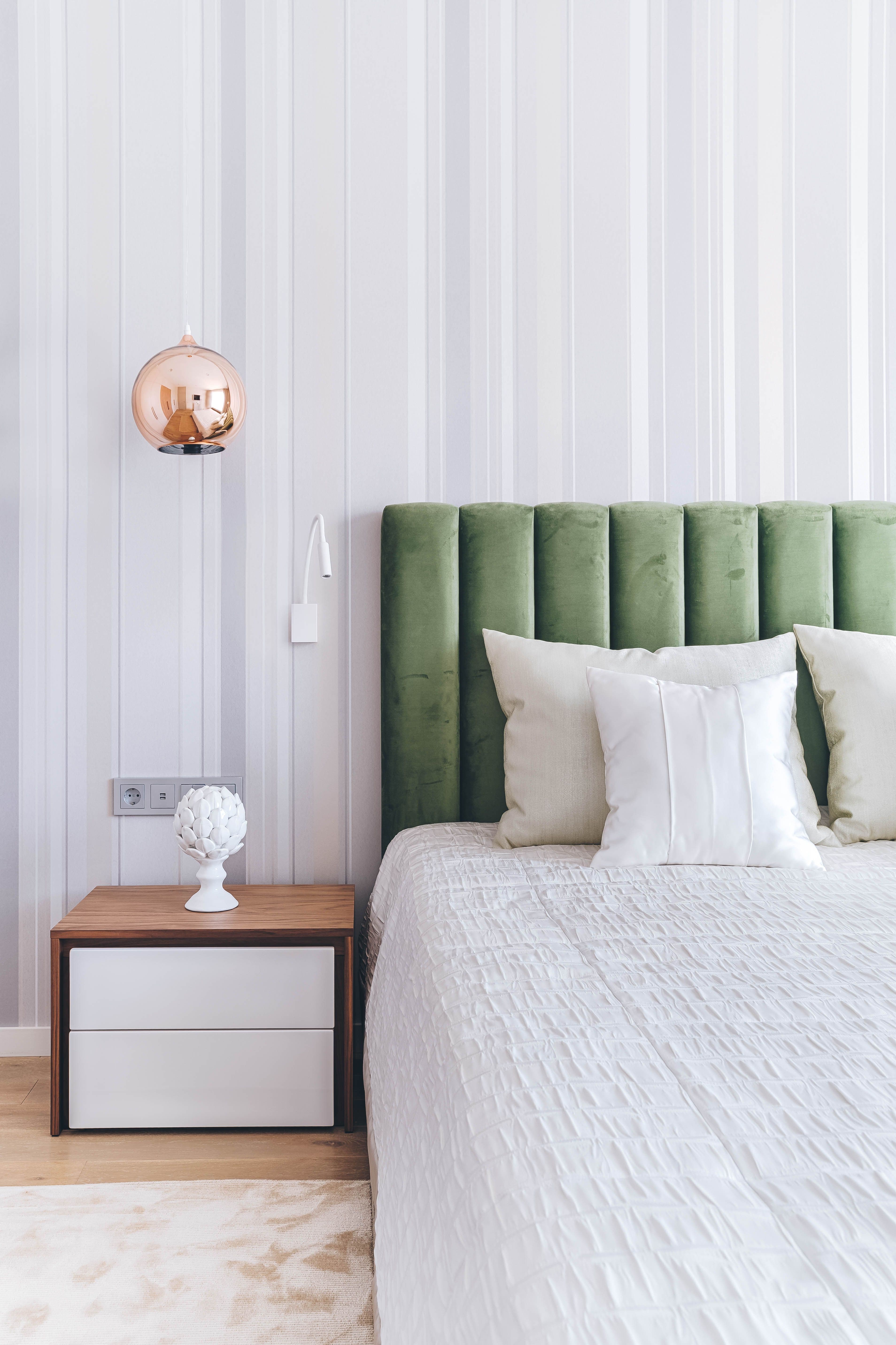Главная спальня наполнена смелыми цветовыми решениями и различными вариантами освещения.