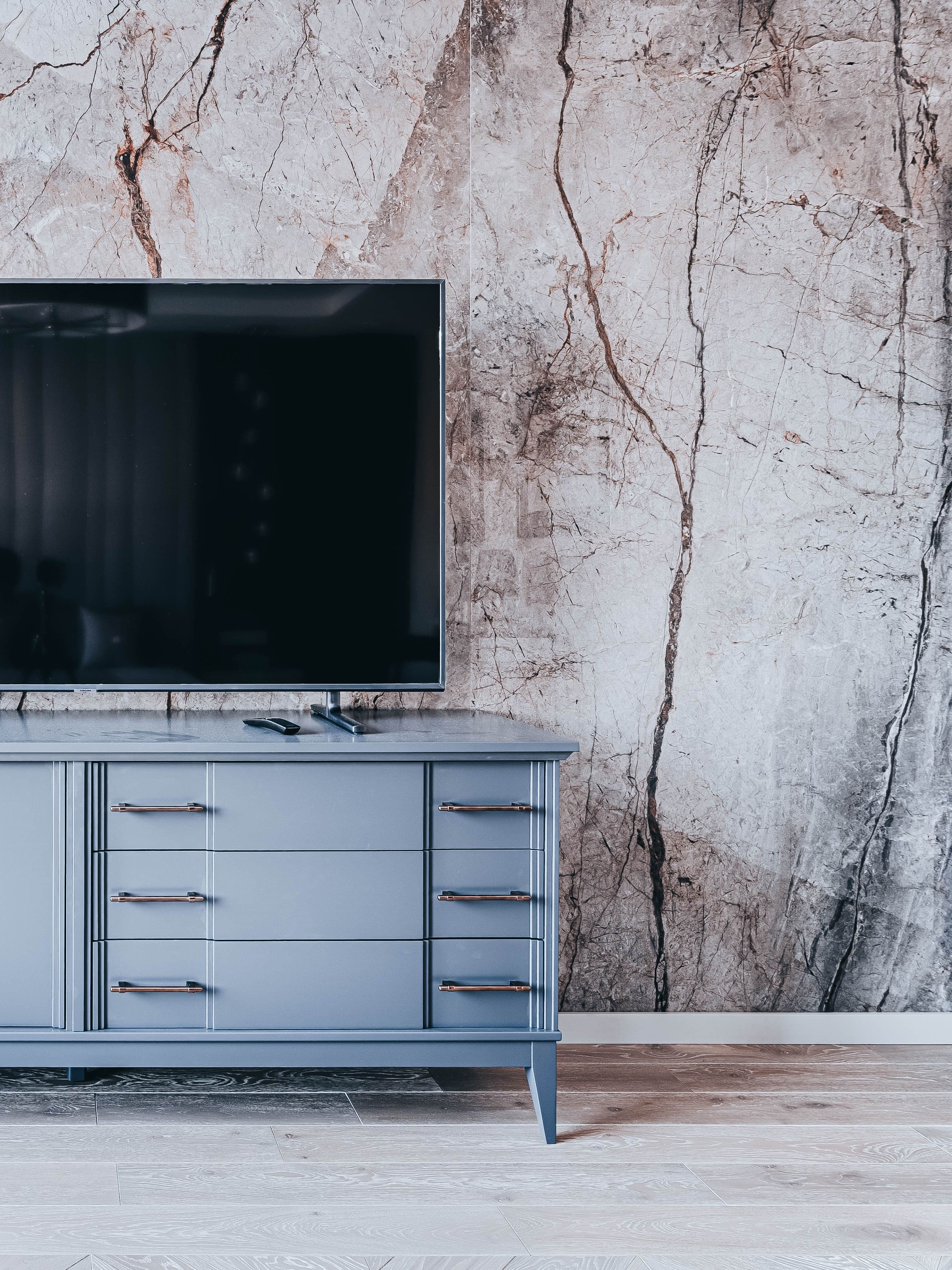 Акцентная стена за телевизором выполнена из крупноформатного керамогранита.